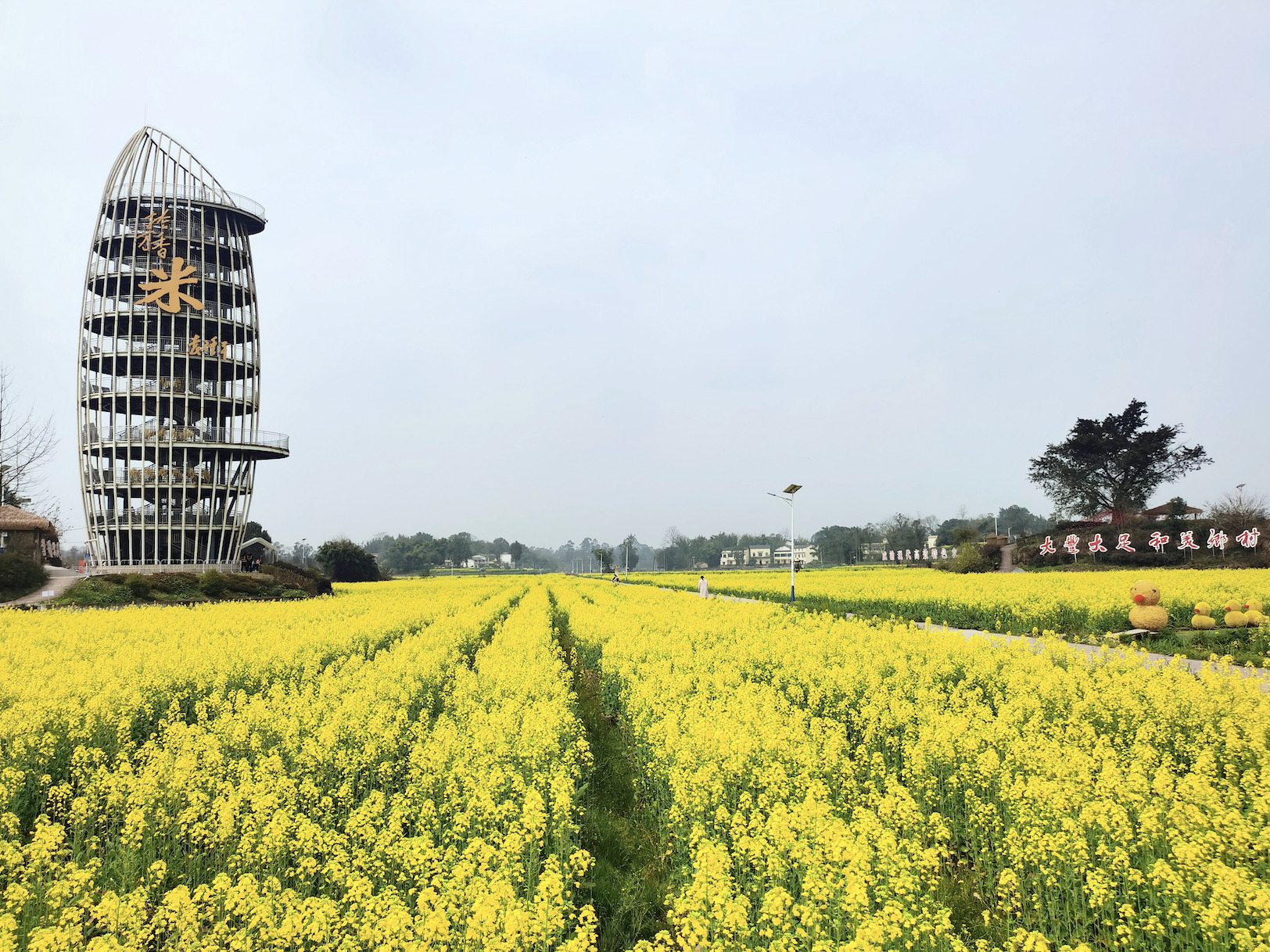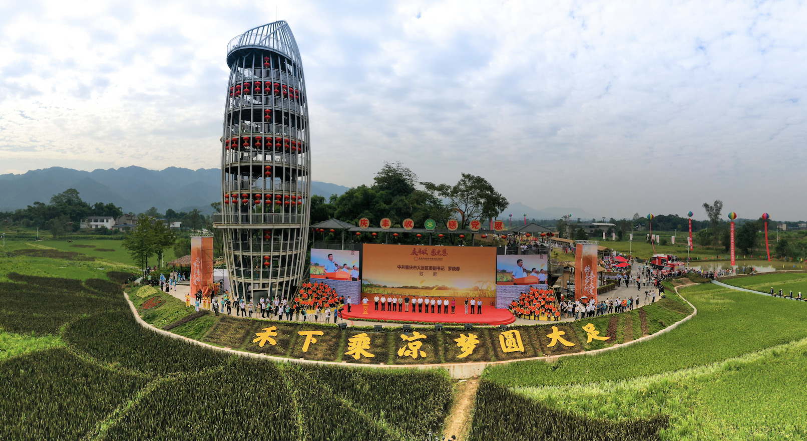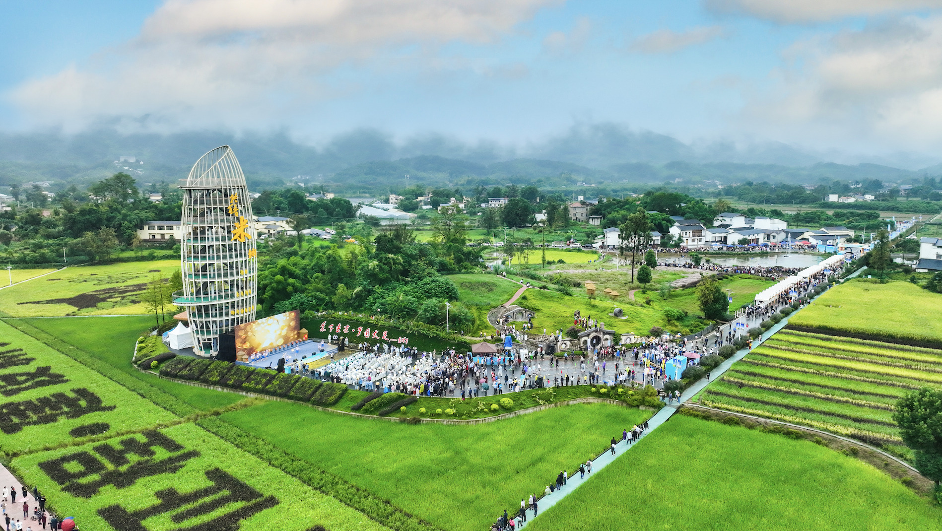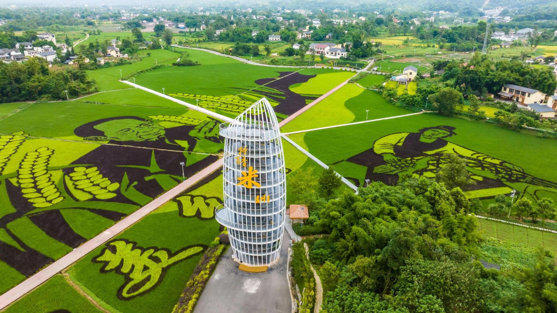The Rice shape Sightseeing Tower, as a landmark building in the colorful pastoral Scenic Area, stands at a height of 30 meters and has an appearance resembling a "grain of rice". It is the largest grain of "rice" in the world and echoes the inscription of Academician Yuan Longping, "Enjoying the Coolness under the Grass,realizing the dreaming of Dazu". As tourists climb up the stairs, the rice patterns gradually become clear, overlooking the entire scenic area and taking in the colorful rice patterns. Standing on the Sightseeing Tower, they can appreciate the pastoral scenery of "the wind blows the rice ears with layers of waves, and hometown is filled with grain everywhere".